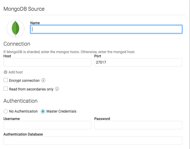 | Hosts | A list of Mongo hosts. If MongoDB is sharded, enter the mongos hosts. Otherwise, enter the mongod host. |