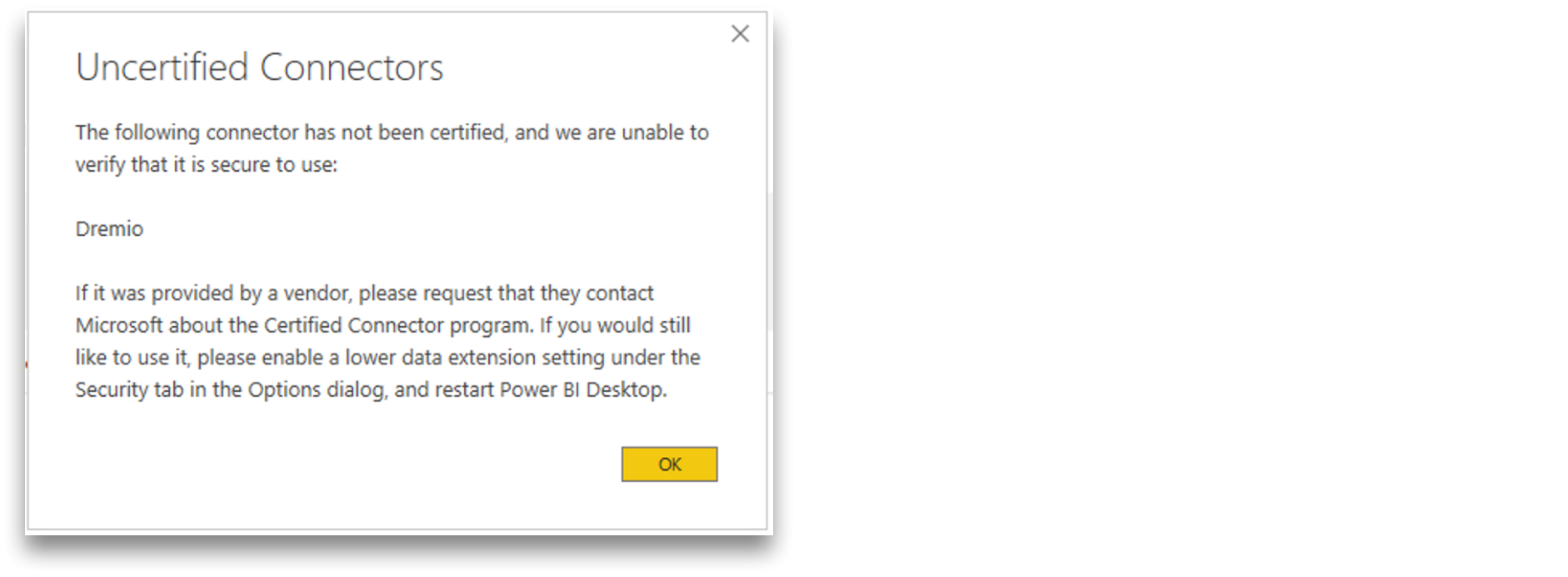 When the Power BI Desktop is opened and the Dremio connector is selected in Get Data, the following pop-up message appears: