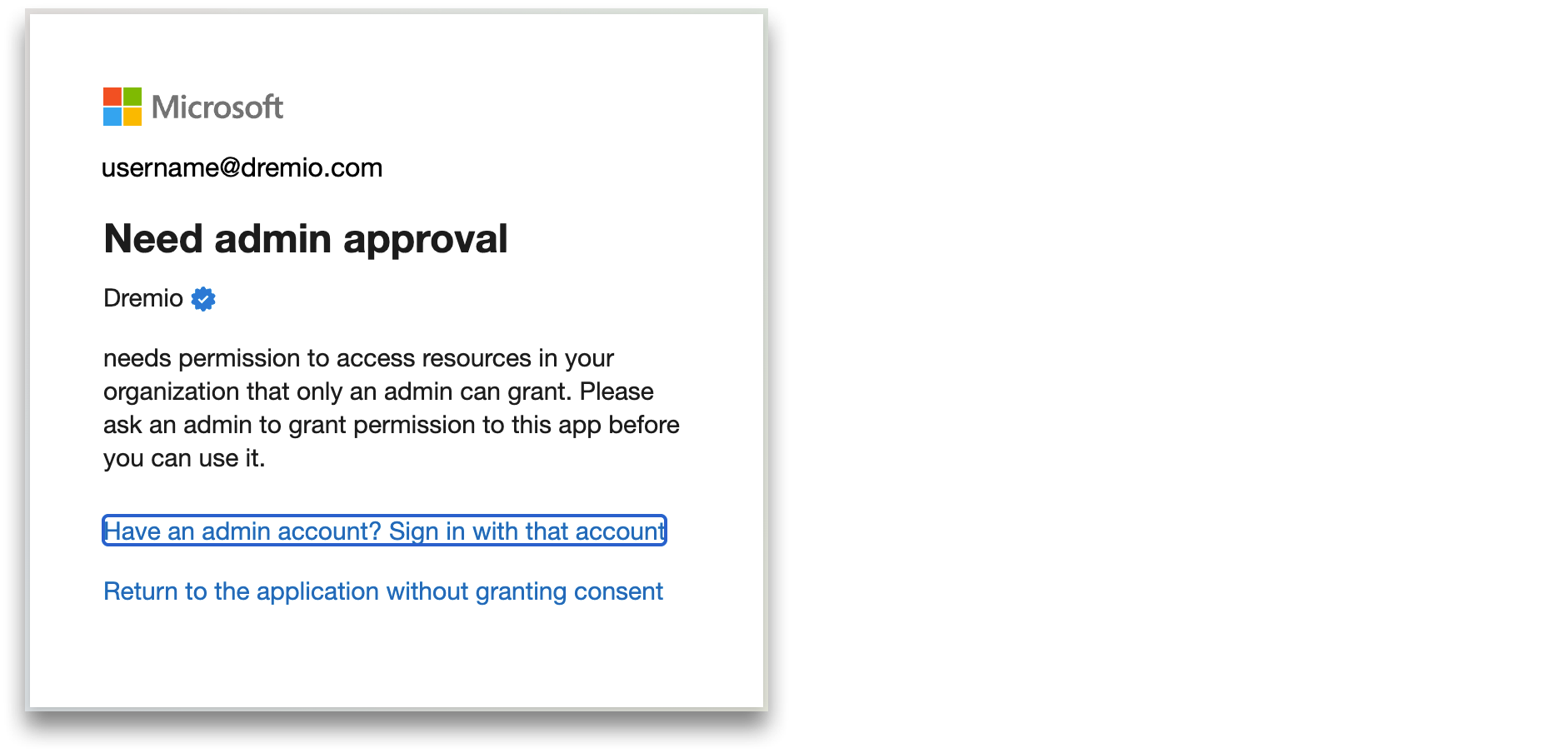 Next, sign in with your Dremio account. You will then be directed to a screen that asks an admin to sign in. It will look similar to this message: