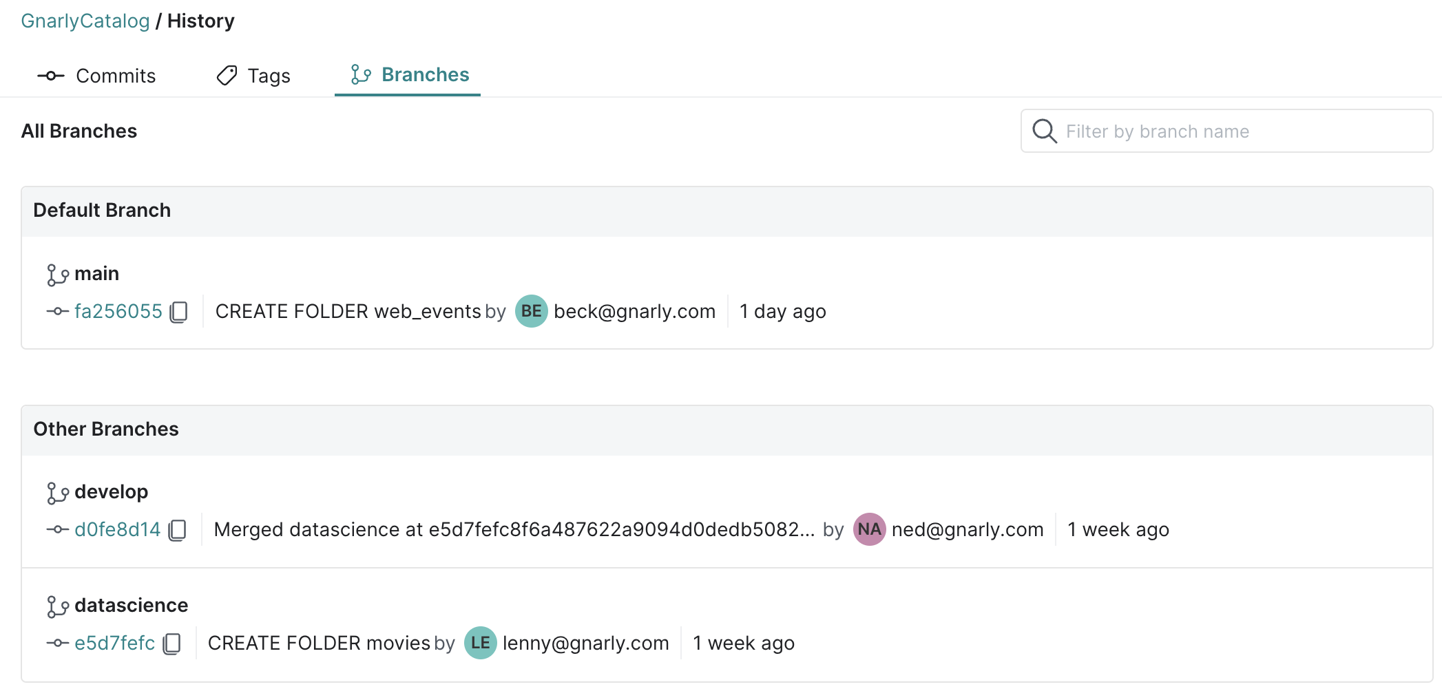 - A branch is technically a named reference to a series of commits in a catalog.