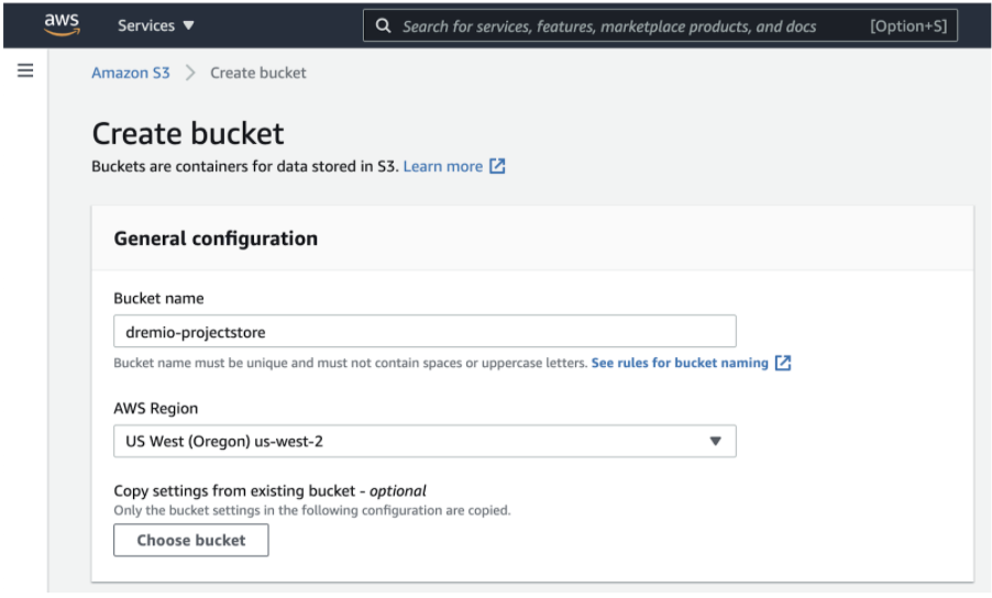 - For Bucket name, enter a name (for example dremio-projectstore).