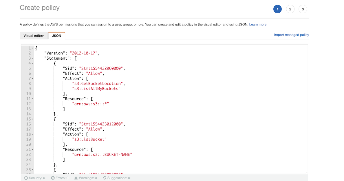 On the Create policy page, click the JSON tab and paste the IAM permissions policy into the editor.