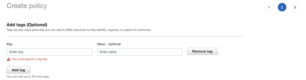 (Optional) In the Add tags page, you can add tags as key-value pairs to AWS resources for helping identify, organize, or search for AWS resources. Click Add tag. Enter a key and a corresponding value. You can add up to 50 tags.