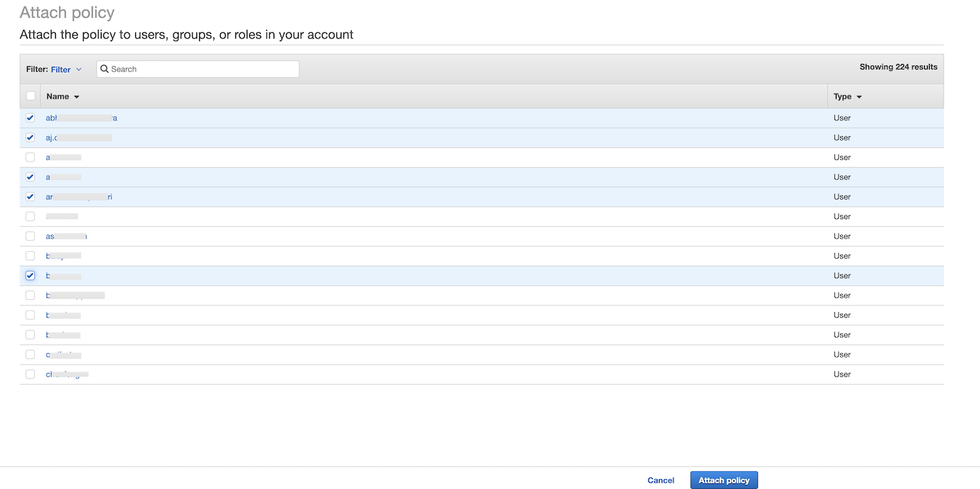 Select one or more roles/users to attach the policy to by checking the boxes. You can use the Filter menu and the search box to find the role/user if required.