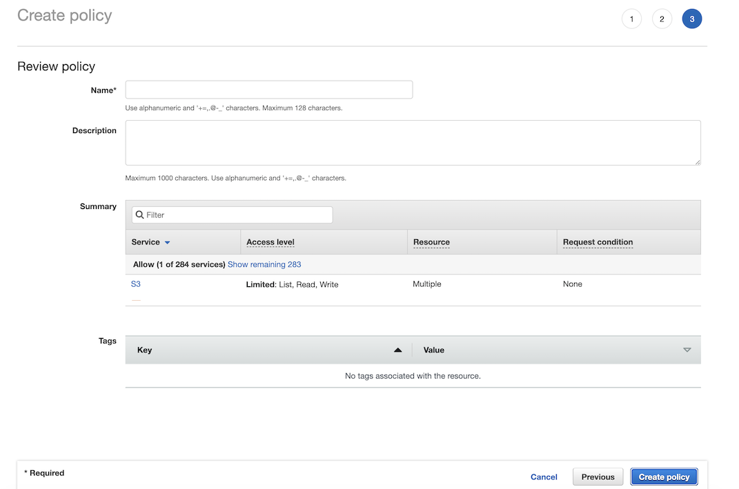 The Summary section shows the properties of the policy that is being created. This section shows whether or not the actions defined by the policy that is being created have an applicable resource or condition. Ensure that to grant access, policies must have an action that has an applicable resource or condition.
