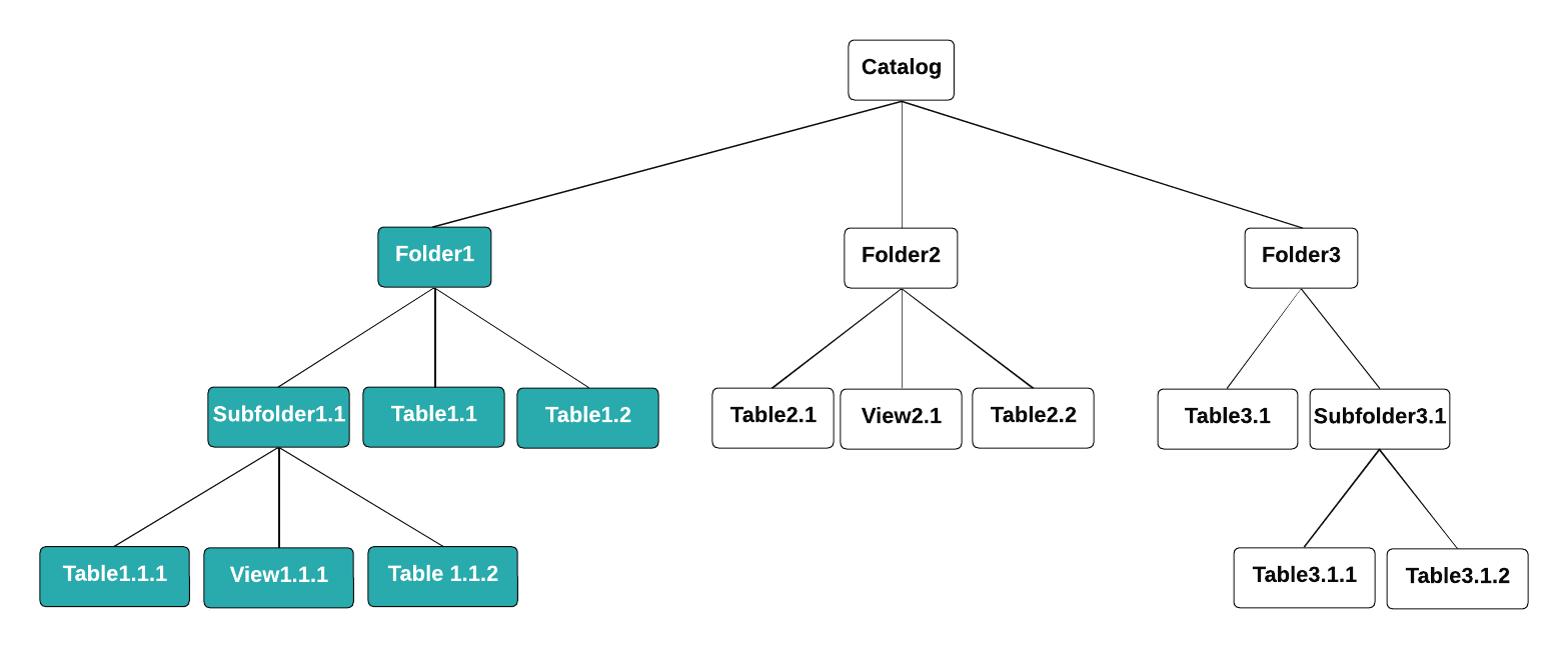 For example, suppose a user is granted certain privileges on a single folder in an Arctic catalog, and the catalog contains several other folders. As shown in the following diagram, that user has the same privileges on Folder1 and all of the objects Folder1 contains. Due to the inheritance model, the user also has the same privileges on any objects that are created in Folder1 in the future. The user does not have privileges on Folder2 or Folder3, nor any of their contents. The scope of the user's access is Folder1: