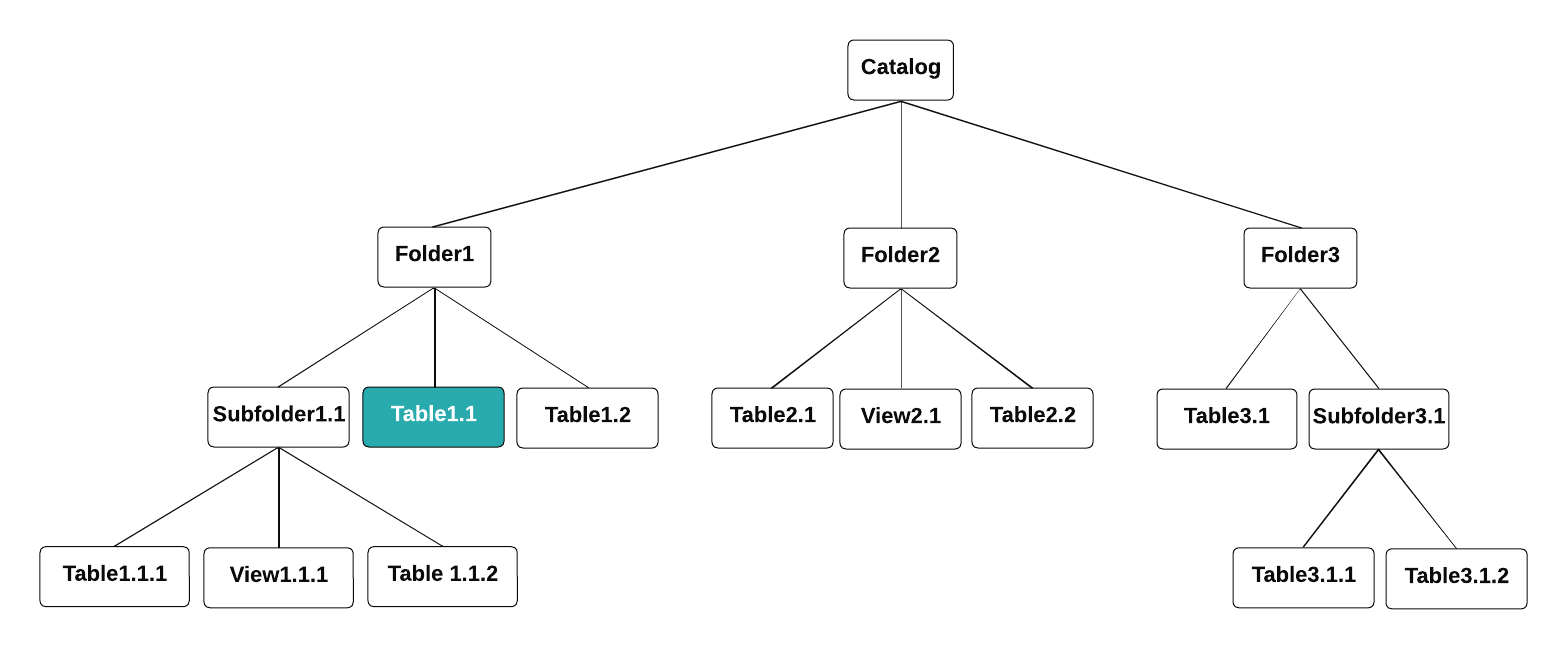 If the user should be able to run queries only on Table1.1, you can grant them the USAGE privilege on the catalog and the SELECT privilege only on Table1.1. The user won't be able to access or query any other tables or views in the catalog. However, the user will be able to create views based on Table1.1, and they can then grant privileges on the views they create to other users: