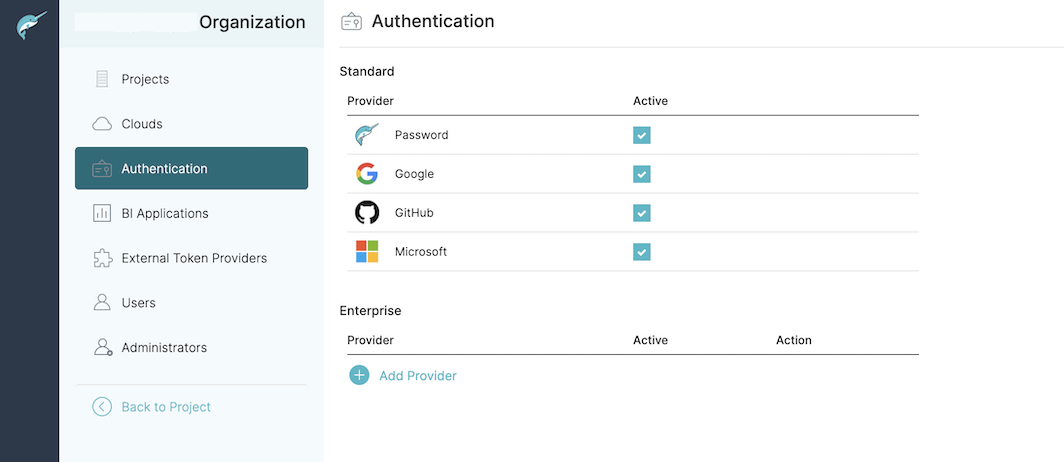 To deactivate a provider, deselect the checkbox for the desired IdP under the Active column.