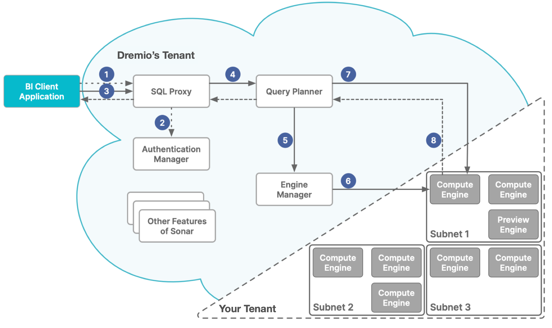 Dremio Cloud homeDremio SonarOn this pageDremio Sonar Dremio's control plane hosts Sonar projects and the objects in them, and the execution plane runs queries against data sources that are connected to Sonar projects. How Queries Run Across the Two Types of Planes