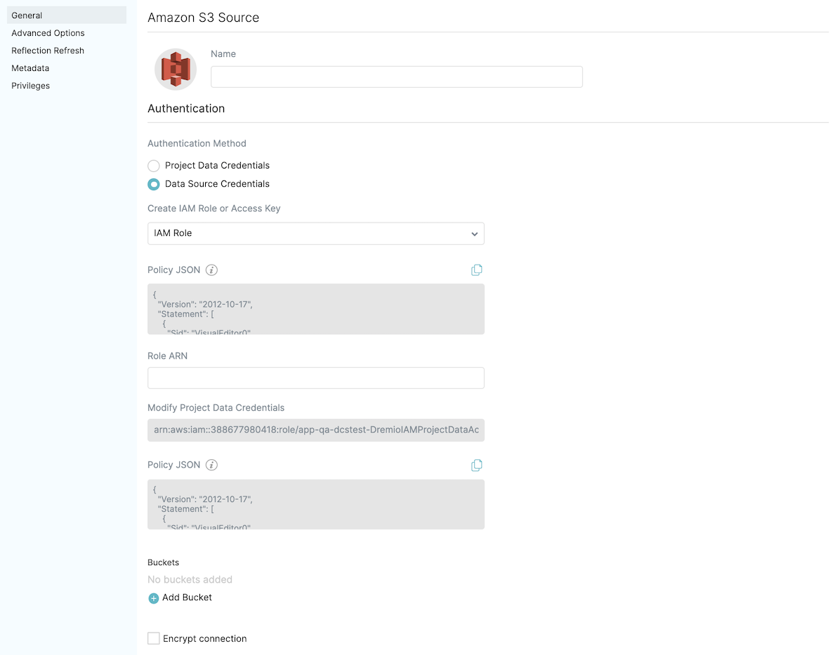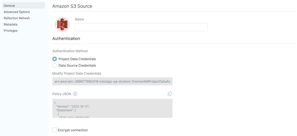 - For Authentication Method, select Project Data Credentials. Note that the IAM role that is used in the project data is shown under Modify Project Data Credentials.