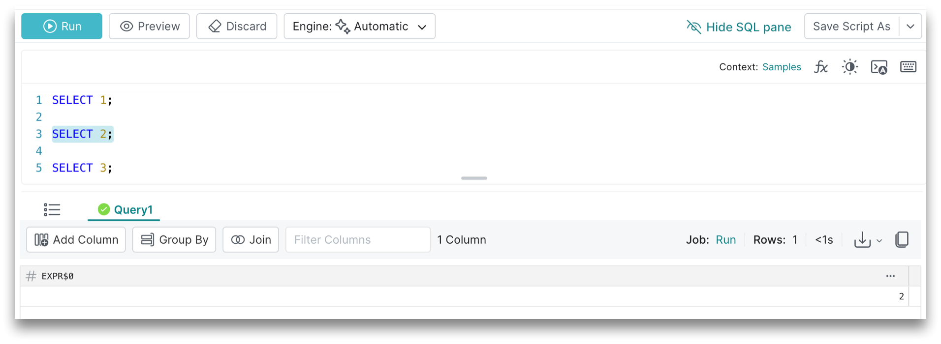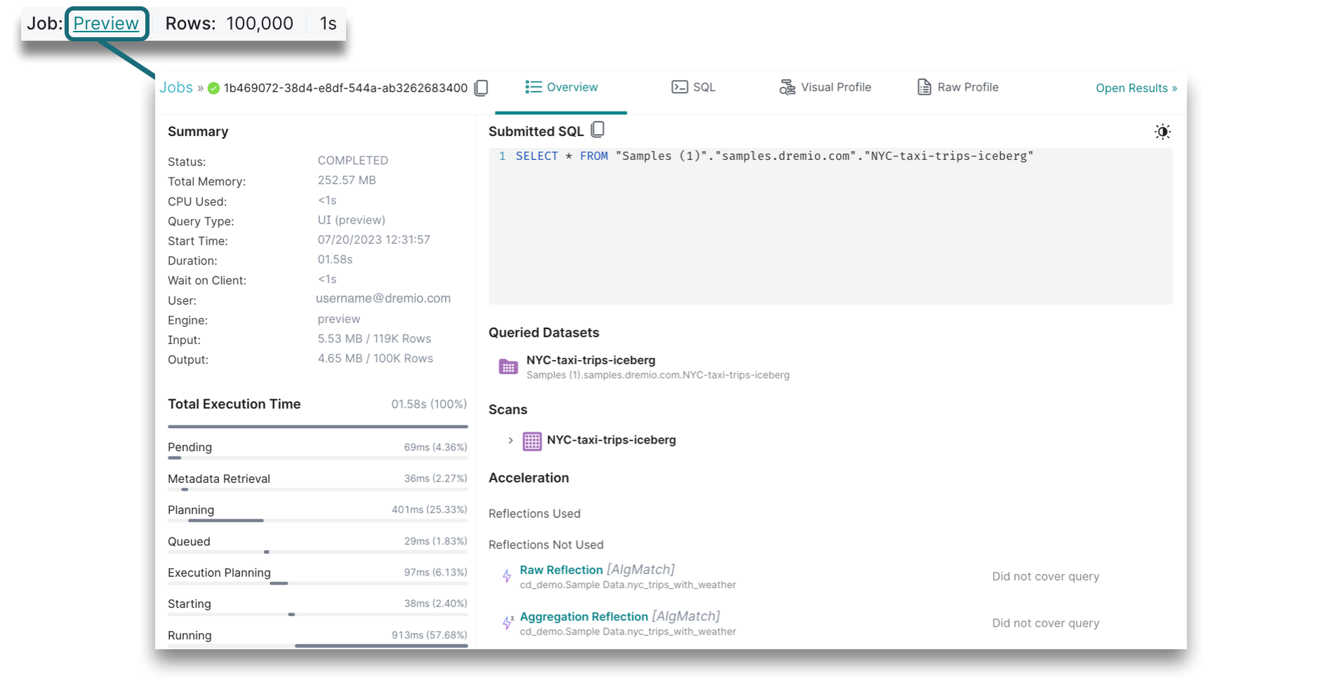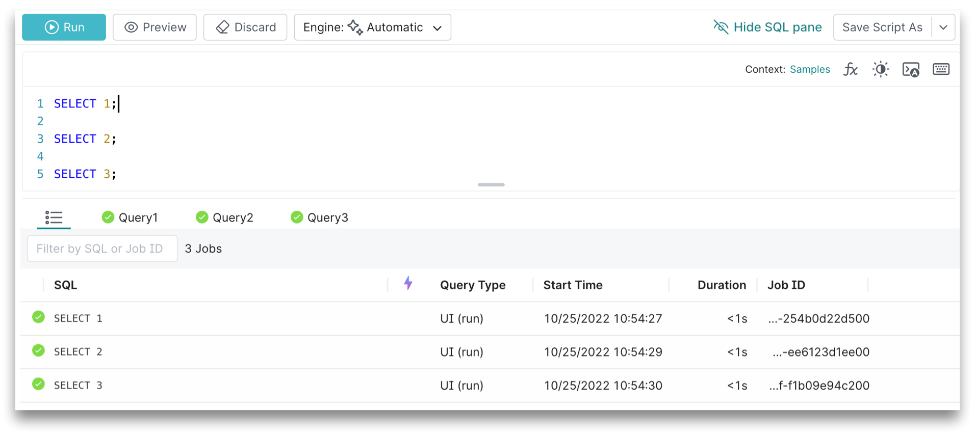 Executing a preview returns a subset of rows in the result set. Like the run mode, running the preview job will route the query to the selected engine, although the preview mode runs a subset of your results in less time.