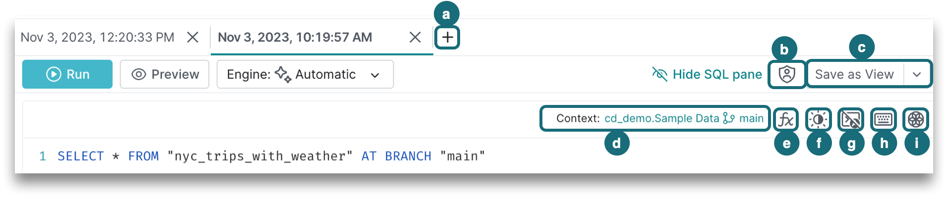 f. Toggle the dark/light mode to change the theme of the SQL editor.
