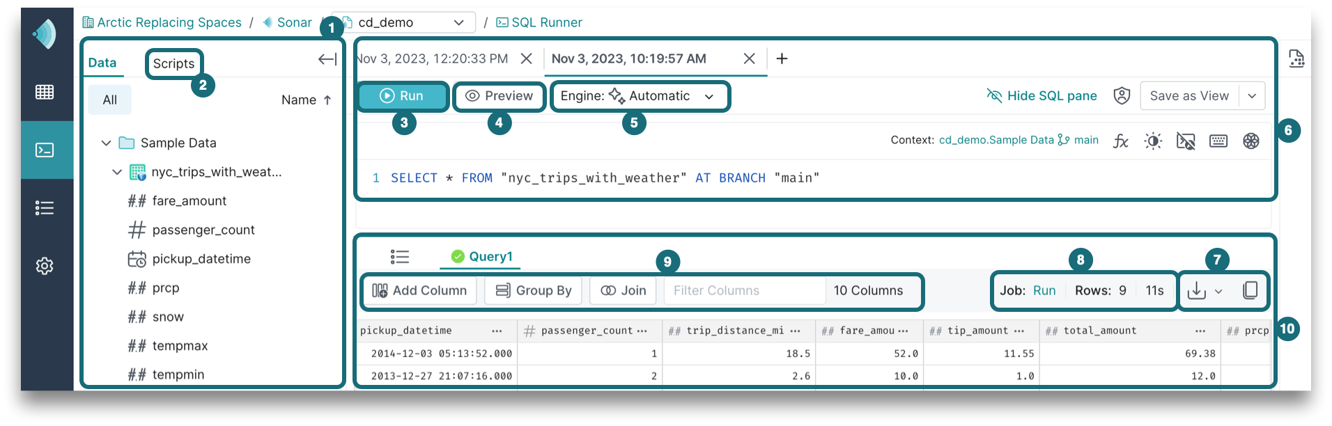 The SQL Runner is where you run queries on your datasets and get results. To navigate to the SQL Runner, click in the side navigation bar. The main components of the SQL Runner are highlighted below: