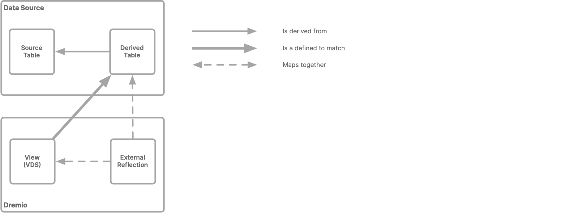 You can accelerate queries by running them against table materializations that are in a connected data source. You select your source data, and then you create a derived table, such as an aggregation. Next, in Dremio Cloud, you define a view that matches the derived table. Finally, you map the view to the derived table. The mapping is an external Reflection.