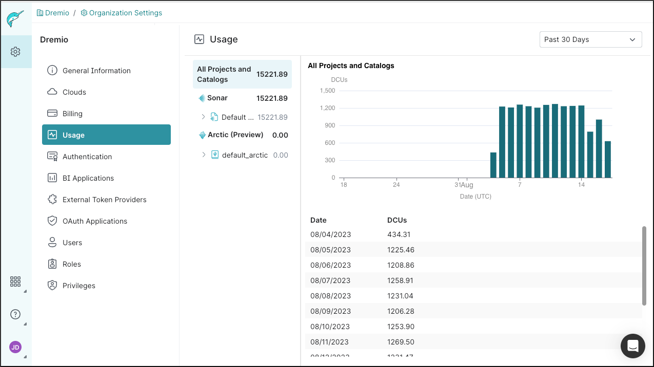 Dremio uses the data in the sys.organization.usage table to determine the total monthly bill. Dremio calculates the DCU count for each row by multiplying column values instance_count * instance_hourly_cost_dcus * (end_time - start_time). Then, Dremio sums the DCU count for each row that occurred within the billing period.