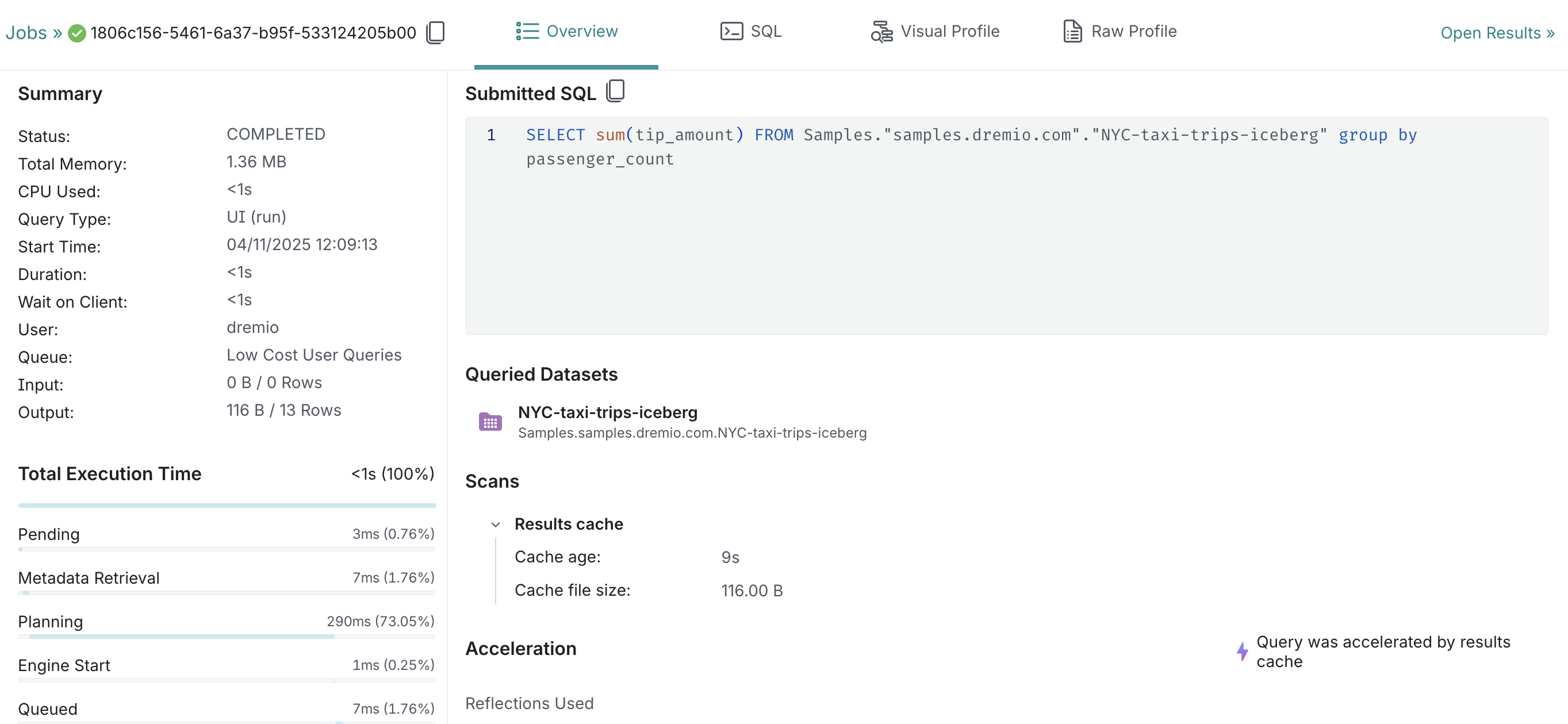 In Dremio, queries can be accelerated with Reflections and results cache.