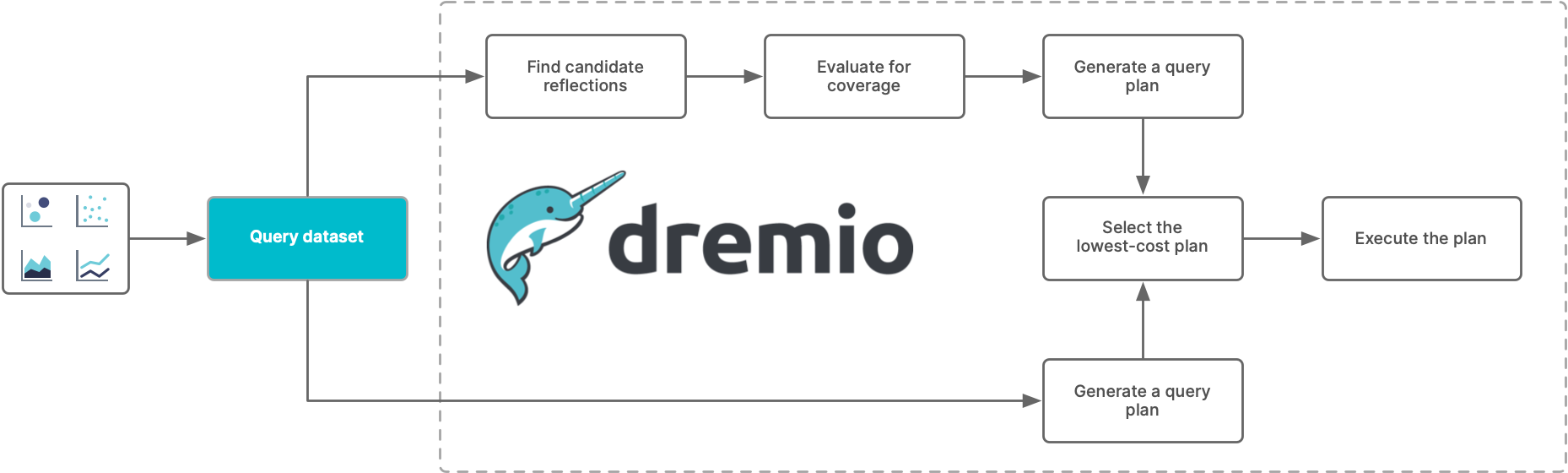 When Dremio receives a query, it determines first whether any Reflections have at least one table in common with the tables and views that the query references. If any Reflections do, Dremio evaluates them to determine whether they satisfy the query. Then, if any Reflections do satisfy the query, Dremio generates a query plan that uses them.