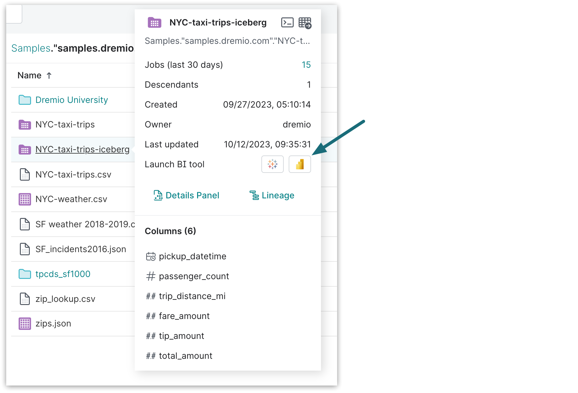 A sample file with the complete dataset location in its filename and Microsoft Power BI Desktop Data Source as the file type, is downloaded. For example, Samples.samples.dremio.com.NYC-taxi-trips-iceberg.pbids.