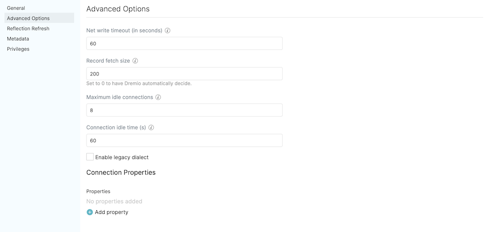- Record fetch size: Number of records to fetch at once. Set to 0 (zero) to have Dremio automatically decide. Default: 10