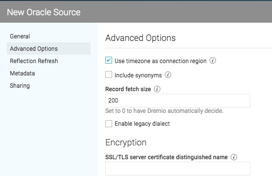 - Record fetch size: Number of records to fetch at once. Set to 0 (zero) to have Dremio automatically decide. Default: 10