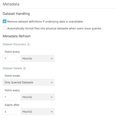 - As Needed -- Dremio updates details for a dataset at query time. This mode minimized metadata queries on a source when not used, but might lead to longer planning times.