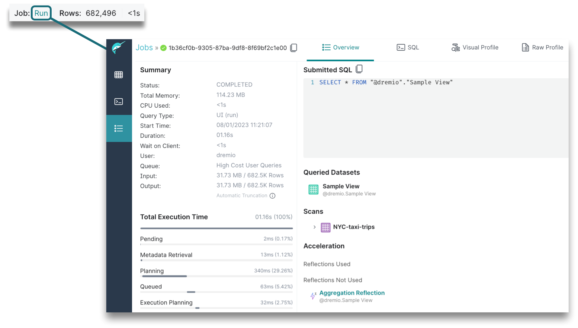 The execution state will show you the type of job that was run, the number of records, and the amount of time that it took to run the query. When you click on the linked job, a Job Overview page opens in a new tab, providing a summary, total execution time, Reflections data, job results, and more details. If a job took too long or failed, viewing the job overview can help you troubleshoot what actually happened.