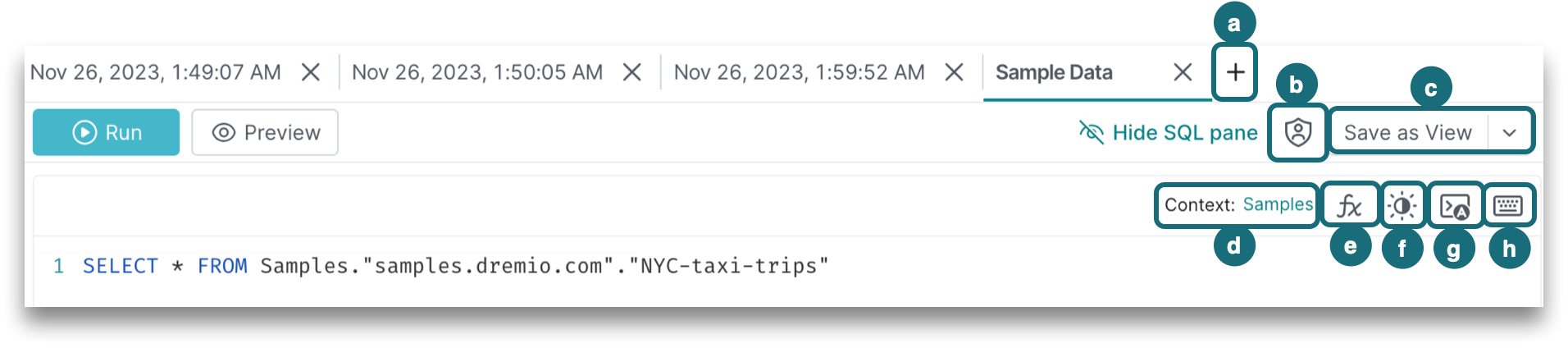 f. Toggle the dark/light mode to change the theme of the SQL editor.