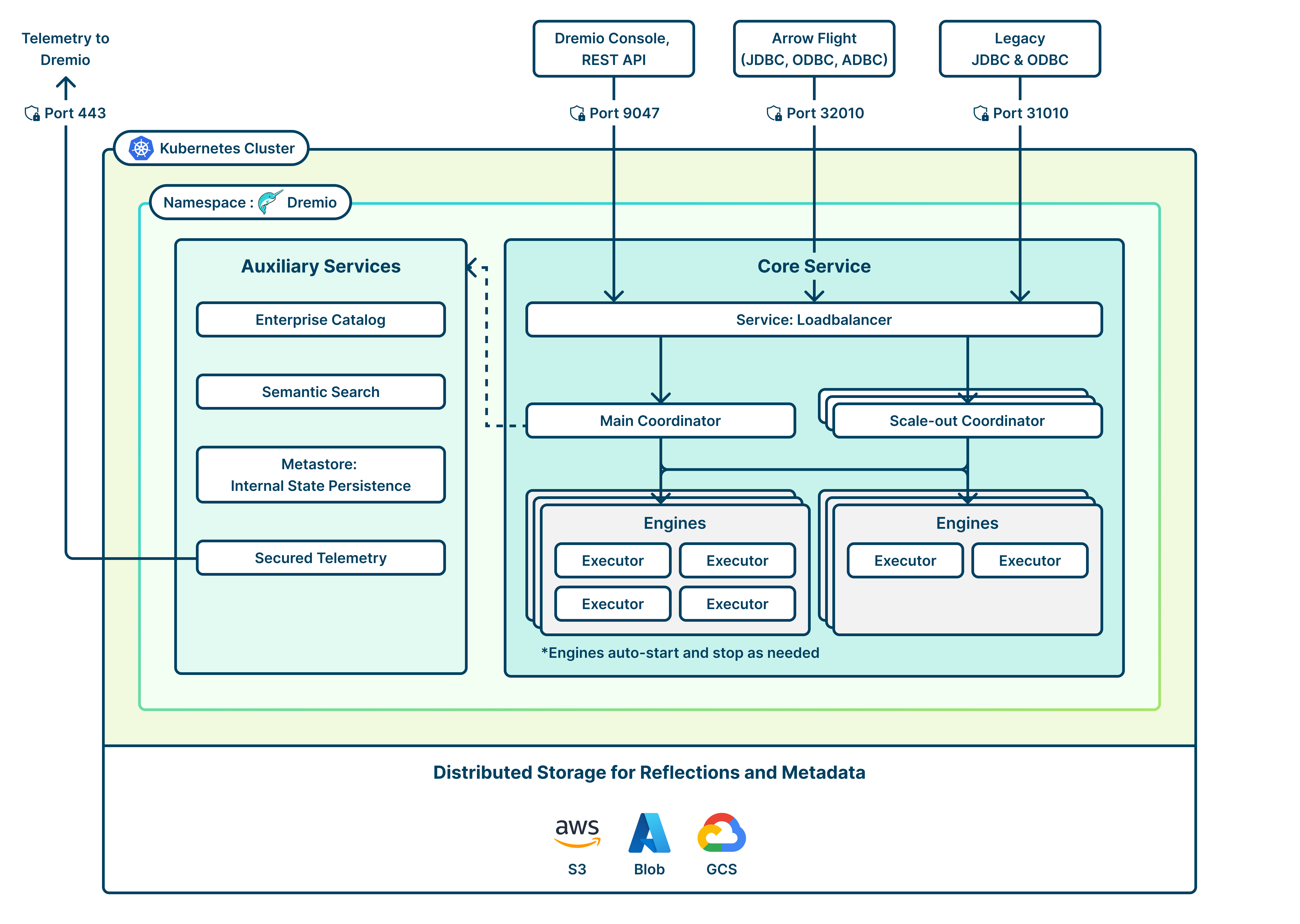 Dremio’s core services are fundamental components that enable its high-performance, distributed query engine and data lakehouse capabilities: coordinators and engines.
