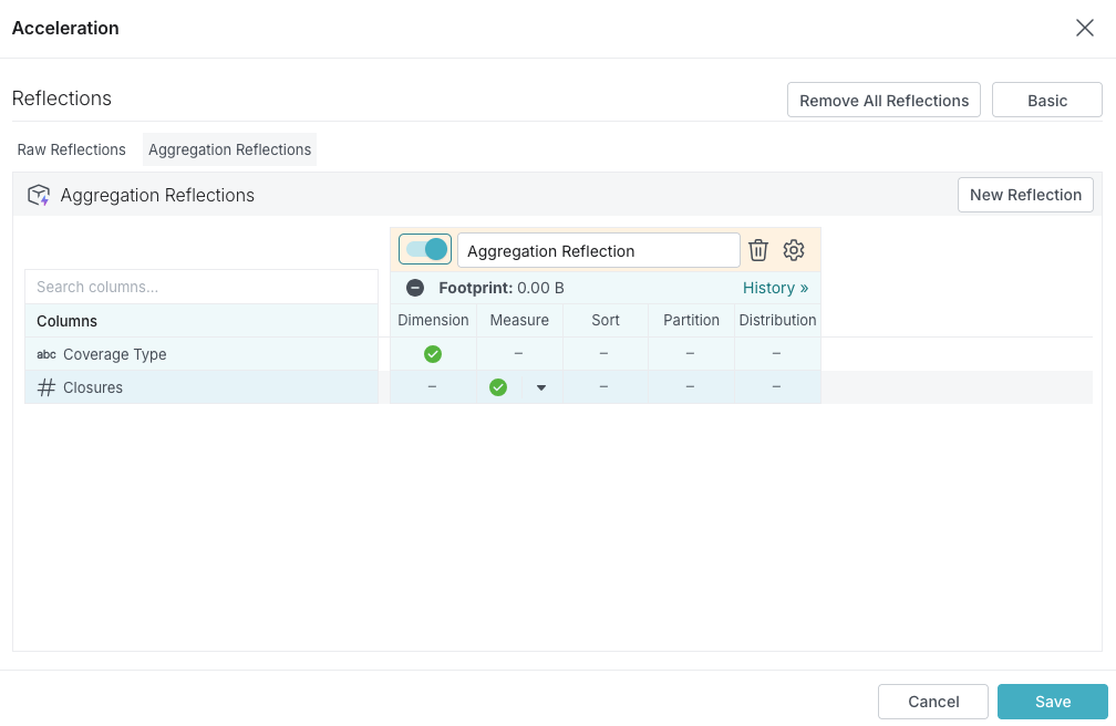 - If there is only one aggregation Reflection for the table or view, in the Basic view, click the toggle switch in the Raw Reflections bar.