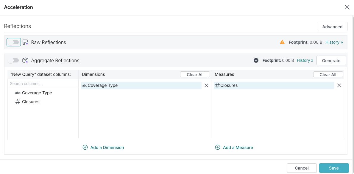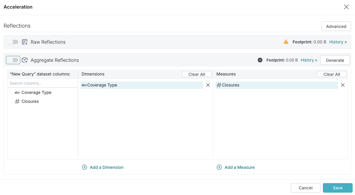 In the Aggregations Reflections section of the editor, click Generate to get recommended fields to use as dimensions and measures. This will override any previously selected dimensions and measures. If you wish to proceed, click Continue in the confirmation dialog that follows.