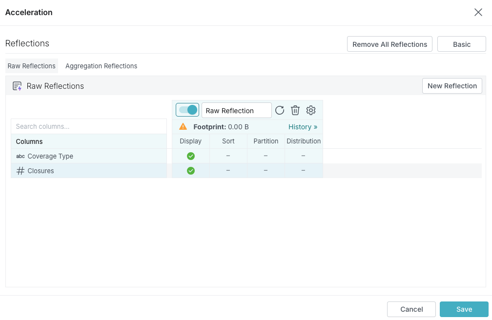 In the Basic view of the Reflections editor, you can create a raw Reflection that includes all of the fields that are in a table or view. Creating a basic raw Reflection ensures that Dremio never runs user queries against the underlying table or view when the raw Reflection is enabled.